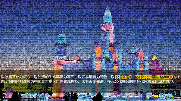 哈尔滨冰雪大世界四季乐园(以下简称园区)位于太阳岛风景区西区,是展示太阳岛风景区冰雪文化的核心区域,也是哈尔滨市重要旅游产品之一。园区自开园至今已历经17年的发展,开园时间集中在每年12月至次年2月,其余时间园区闲置;每年冰雪节的主题各有不同,但都以冰雪展览及小型冰雪娱乐项目为主。